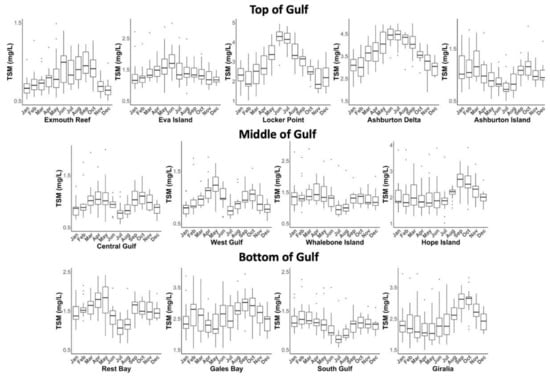 All locations within Exmouth Gulf exhibited a high degree of seasonality, with mean monthly TSM differing significantly in all months (Kruskal–Wallis p < 0.01; Figure 5), and seasonal trends coinciding within similar regions of the Gulf. For example, sites located across the top of the Gulf exhibited elevated TSM during winter months and lower values during summer months, with Locker and Ashburton Delta showing the most obvious summer–winter TSM pattern with Exmouth Reef and Eva Island exhibiting the same pattern but to a lesser extent. Ashburton Island site was the anomaly showing the opposite trend higher TSM value in autumn and spring and lower values in winter and summer. This autumn–spring pattern was observed at sites located across the middle of Exmouth Gulf including Central Gulf, West Gulf, Whalebone and Hope Islands. Southern Gulf sites including Rest and Gales Bays, South Gulf and Giralia exhibit a spring peak in mean monthly TSM with only Rest Bay having an autumn peak, with the other sites exhibiting lower mean monthly TSM across the rest of the year.