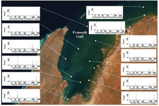 Spectral analysis of daily TSM supports the observed seasonal turbidity trends. For example, those sites experiencing a single winter TSM peak return a very strong spectral frequency of 360 days while sites that experience autumn and spring peaks returned a spectral analyses frequency spike at 180 days. Sites located in the southern Gulf, including Giralia, Hope Island, Gales and Rest Bay were also found to exhibit a spectral frequency spike at 14 days, coinciding with the spring–neap tidal period (Figure 6).
