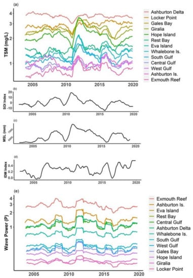 Time series analysis from 13 locations around the Gulf showed that there was interannual variability of turbidity at all sites (Figure 7a). The influence of ENSO at each of the 13 locations was seen in the time series (12-month rolling mean) for TSM, wave power, MSL, ENSO and IDM, where higher turbidity, sea level and wave power are apparent following strong ENSO (SOI index) events (Figure 7a–e). This influence was especially strong during the 2010/2011 extreme La Niña event.