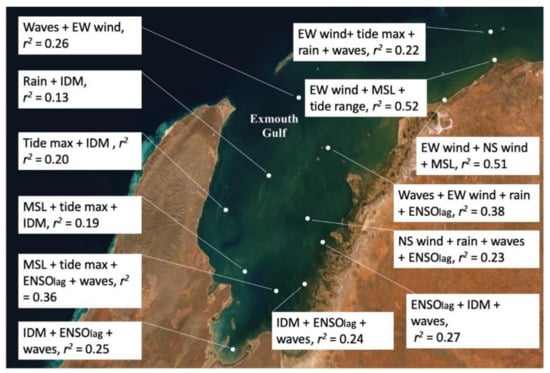 To quantify the contribution of metocean processes to turbidity in the Exmouth Gulf, stepwise regression models were constructed for each of the 13 time series locations. Environmental variables that showed a significant Pearson’s r correlation with turbidity were included in the initial step of the regression, with the least significant variables removed at each step. An Akaike information criterion (AIC) test was used to find the best of the stepped models, being the one that explains the greatest amount of variation using the fewest possible independent variables (lowest AIC). The AIC compares models to find the model with the best ‘fit’ and is known to minimise the risk of choosing a bad model [56]. Monthly average values were used for all variable inputs including ENSO and IOD indexes, wave power, east–west and north–south components of the wind, rainfall and mean sea level (each variable described in Section 3.3.1); monthly mean was also used for turbidity (TSM). A separate Pearson’s correlation analysis was performed against turbidity and the three-day tidal range average to ensure this variable was captured at finer timescales. Note that environmental variables were considered at the same value for all locations in the Gulf, except for waves, which were extracted independently for each time series location.