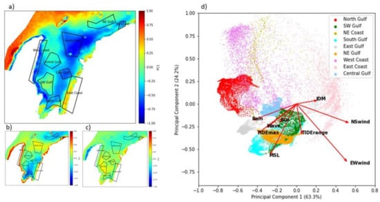 (a–c) Principal components 1, 2 and 3 (respectively) with overlay of nine geographical regions used to construct the biplot; (d) bi-plot showing the first two principal components that explain environmental drivers of turbidity from nine regions in the Exmouth Gulf. The cosine of the angles between the variable arrows estimates the correlations between the variables (from Table 3), the smaller the angle the higher the correlation. The length of arrows is roughly proportional to the standard deviation in the correlations for that variable, meaning that the longer the arrow, the more that variable is responsible for separating the groups.