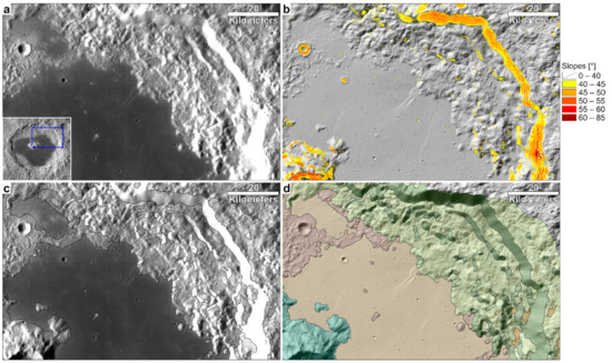 Detailed view of the NE portion of the Tsiolkovskiy crater. (a) Lunar Reconnaissance Orbiter Wide Angle Camera (LROC-WAC) mosaic [30]; (b) DEM-derived hillshade superimposed by the surface slope map highlighting scarps with slopes > 40°; (c) LROC-WAC basemap with geologic contact linework; and (d) geologic units on top of the DEM-derived hillshade.