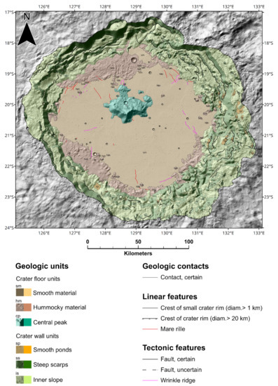 - Fortezzo, C.M.; Spudis, P.D.; Harrel, S.L. Release of the digital unified global geologic map of the Moon at 1:5,000,000-scale. In Proceedings of the 51st Lunar and Planetary Science Conference, The Woodlands, TX, USA, 16–20 March 2020; Lunar and Planetary Institute: Houston, TX, USA, 2020; p. 2760. [Google Scholar]