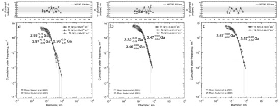 Crater size–frequency distribution (CSFD) measurements performed for areas located on the Tsiolkovskiy crater floor. (a) Age results for the orange color unit (i.e., bp1 unit); (b) age results for the purple-blue color unit (i.e., bp2 unit); and (c) age results for the yellow color unit (i.e., bp3 unit). The randomness analysis results are shown in the panels above the CSFDs.