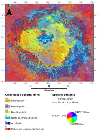 The color-based spectral mapping was performed on the basis of the color variation as from the Clementine UVVIS Color Ratio mosaic (Figure 2b). The different colors of the units can be linked to the different degrees of maturity and/or composition of the materials [19].