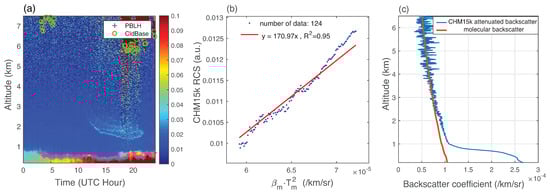 Figure 3 is an example of using the Rayleigh method to calibrate the CHM15k system constant. Figure 3a shows the 5 min averaged RCS profiles of 19 December 2018. During the nighttime, PBL-Height (PBLH) is relatively stable, remaining around 700–800 m and no cloud or aerosol plume appears within a 2–6-km range. The AERONET averaged AOD from 13:00–17:00 UTC on this day is 0.015 at 1020 nm and the aerosol transmittance is about 0.97. For calibration, the RCS profiles are further averaged over 0:00–4:00 UTC. The averaged RCS and molecular backscatter coefficients at 0:00 UTC of 3.2–5 km are shown in Figure 3b. The correlation is about 0.95 and the linear regression slope is 170.97, which represents the ceilometer system constant . Figure 3c shows the calibrated attenuated backscatter coefficient profile using kmsr (averaged over 0:00–4:00 UTC, blue solid line) and the molecular backscatter profile coefficient (0:00 UTC, red solid line), demonstrating a good agreement between the attenuated backscatter and molecular backscatter coefficients above 3 km.