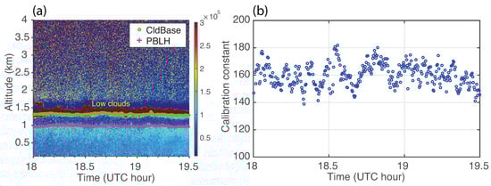 An example of using the liquid cloud method to calibrate the CHM15k system constant. (a) The RCS profiles of CHM15k on 18 November 2018. (b)The ceilometer system constant result calibrated by the liquid cloud method, kmsr.