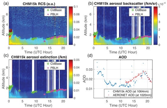 Figure 9a,b show the calibrated attenuated backscatter coefficient profiles and aerosol backscatter coefficient retrieval of 23 September 2020, respectively. The heavy dense aerosol plumes can be seen at 1.5–5 km at 0:00–6:00 UTC and some low and moderately dense plume appears below 3 km at 10:00–16:00 UTC. There are some low-level clouds at 20:00–22:00 UTC which totally attenuate the laser beam above the clouds. In Figure 9a,b, we compare the ceilometer attenuated backscatter coefficients and aerosol backscatter coefficient retrievals from the ceilometer and we found that: (1) the aerosol backscatter coefficients of the aloft aerosol plumes are larger than the attenuated backscatter coefficients due to atmosphere attenuation; (2) the retrieved aerosol backscatter coefficients in the lower altitude are smaller than the attenuated backscatter coefficients because of the molecular contribution included in the attenuated backscatter coefficients. Figure 9c illustrates the aerosol extinction coefficients. By integrating aerosol extinction coefficients within different ranges, the segmented PBL-AOD, aloft plume AOD and the total AOD ( km) are calculated and are shown in Figure 9d. From 0:00 to 15:00 UTC, the major portion of the total AOD is contributed from the aloft aerosol plumes whereas the PBL-AOD is less than 0.02. Starting from 15:00 UTC, the PBLH increases and the aerosols from aloft plume begin to mix into the PBL; the PBL-AOD increases and AOD above the PBL decreases. After 18:00 UTC, most of the AOD is contributed by the aerosols within the PBL. Overall, quantification of the PBL-AOD, AOD of aloft aerosol plumes and columnar AOD is critical to evaluate the impacts of transported aerosol plumes on air quality and it is important for the application of satellite retrieved AOD to air quality studies.