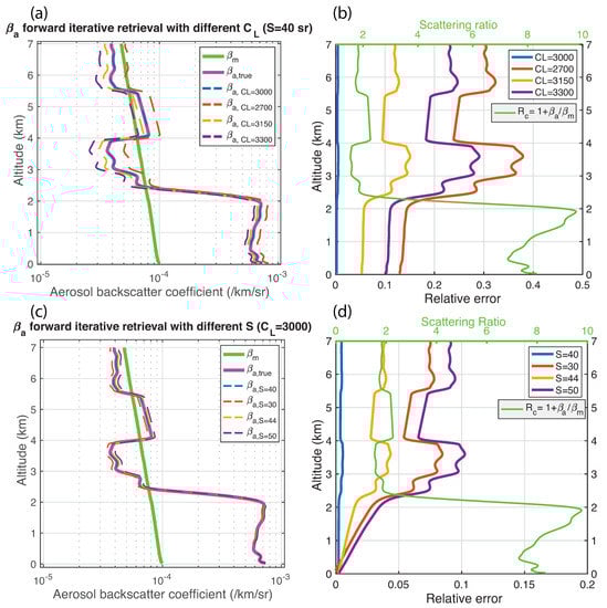 Simulated aerosol backscatter coefficient profiles with different parameters and the corresponding relative errors of the aerosol backscatter coefficient retrievals. (a,b) Simulated aerosol backscatter coefficient profiles using different system constants and their corresponding relative errors and the scattering ratio. (c,d) Simulated aerosol backscatter coefficient profiles using different lidar ratios and their corresponding relative errors and the scattering ratio.
