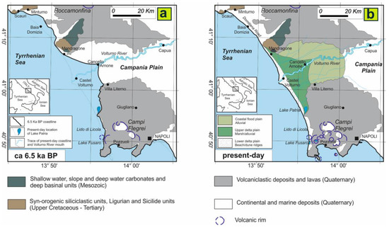 Sketch map of the Late Holocene to present-day geomorphological evolution of the Volturno River delta plain: (a) approximate location of the coastline 6.5 ka BP, inferred from facies analysis based on Sacchi et al. [32]; (b) actual location of the coastline.