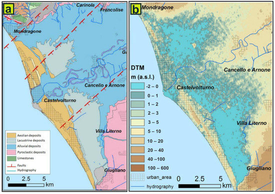 Schematic geologic map of the Volturno River delta plain (a) and digital terrain model of the same area (b), slightly modified from Matano et al. [9].