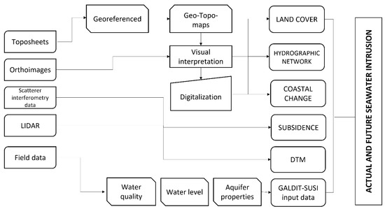 This study highlights how the use of GIS and remote sensing resources can allow for (i) optimizing the input data resolution, (ii) producing new inputs for future assessment and (iii) increasing the overall result’s quality. Nevertheless, it is worth clarifying that this rating methodology cannot overcome the reliability of a process-based numerical model [52,53]. In fact, the rating methods can only generate static snapshots of vulnerability, according to data availability, without highlighting the evolution and trend of the phenomenon over the time. Despite this drawback, the proposed assessment demonstrates how the exploitation of a multidisciplinary approach integrating geological, hydrogeological, geochemical and morphological analysis can return highly reliable results and provide a forecast of the future evolution of SI. The use of high-resolution data contributes to increase the overall assessment reliability, with an accuracy of 7 × 7 m and an error of 5.2 m, calculated by summing the lowest resolution and highest error of the input data (Table 1) with the accuracy of georeferenced points used to create the raster maps.