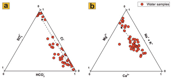 The major anions (a) and cations (b) ternary plots highlight the increasing trend in Cl− concentration, followed by alkali ions and Mg2+ concentrations.