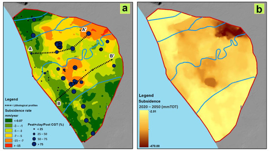 (a) Actual subsidence rate (mm/year), classified from lower (green color) to higher (red color) rates, orientation of lithological profiles shown in Figure 7 (dotted lines) and borehole locations (blue dots) classified accordingly to the increasing ratio between Peat + clay/Post-Campania Grey Tuff (CGT). (b) Calculated total subsidence (mm) obtained by multiplying the subsidence rate shown in (a) for a 30-year period (2020–2050).