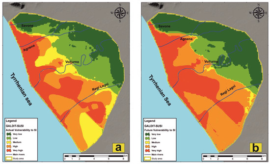 Actual (a) and future (b) vulnerability to seawater intrusion (SI) calculated according to the GALDIT-SUSI methodology.