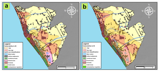 Figure 9 shows a comparison between the distribution of the high and very high SI vulnerability with the study area’s land use. The actual distribution of the vulnerability to SI (Figure 9a) affects several typologies of land use, such as urban area, forest, greenhouses and a large portion of arable land, for a total extension of 6000 ha. The situation worsens considering the 2050 scenario (Figure 9b), where the extension of SI could increase, influencing a larger portion of arable land. In detail, approximately 4000 ha more could face salinization issues compared to 2020; in fact, in 2050 the total extension of arable land with high and very high vulnerability will be 10,260 ha. Whereas more than 70% of these territories are currently utilized for agricultural production, the predicted scenario for 2050 could lead to a reduction in suitable land for agriculture [50] due to soil salinization. Here, the shallow depth to the water table together with the depressed morphology, which will enhance water salinization, could directly influence the quality of water taken up by roots, thus limiting plant growth [51].