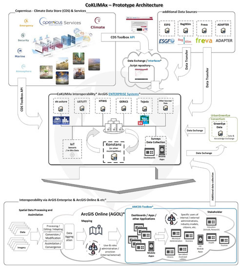 Data acquisition and management (Big Data) are a crucial part of the project and the city and its daily business, primarily due to the greater amount of diverse data than ever before. Whether it is 3D imagery, real-time, or big data, the volume, and data types are constantly increasing. Data (i.e., climate data, urban data, environmental data, or even sensor data) comes from all kinds of sources and sensors. It is essential to organize and manage that data properly. The applied and used software suite shall help the consortium make better and informed decisions to enhance the productivity for all stakeholders, particularly for and across the entities of the city of Constance with all its administrative departments, together with external business. Therefore, the CoKLIMAx software architecture is built with and around the ArcGIS platform, which is in the center of spatial data storage and better organized GIS data management and workflows to collect, store, maintain, prepare, and share relevant data.