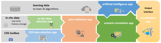 The climate data store (Copernicus Climate Data Store, CDS; https://cds.climate.copernicus.eu/#!/home, accessed on 30 August 2021) provides access to a multitude of climate datasets through a searchable catalog (e.g., [28]). CDS datasets include observed historical climate data records and estimates of essential climate variables (ECVs) derived from Earth observations, global and regional climate reanalysis of past observations, seasonal forecasts, simulated past climate, and future climate change projections. The access to data is open, free, and unrestricted. An online toolbox is available to allow users to create workflows and applications tailored to their needs. An application programming interface (API) enables users to automate their interactions with the CDS and allows direct integration of CDS offerings and functions into software tools. CDS data and tools form the backbone of the C3S sectoral information system (SIS), which provides tools and applications for dealing with climate impact in different industrial sectors, including energy, water management, and agriculture (e.g., [29]).