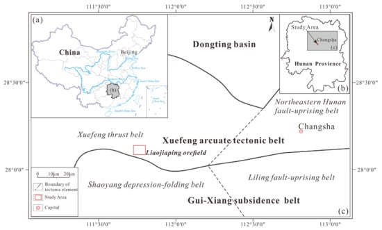 Liaojiaping Orefield, covering an area of 41.25 km2 and located in the central Hunan province, China, is situated in the southern margin of the middle XATB, which is developed between the Dongting Basin and the Gui-Xiang subsidence belt in the Yangtze Block and consists of Northeastern Hunan fault-uprising belt and the Xuefeng thrust belt (Figure 1). The approximately EW- and NE-striking faults and the secondary anticlines with the NE direction axis in this tectonic setting form the basic structural framework of the orefield (Figure 2). These multi-phase geological structures intricately crisscross and lead to the dip and steep landform.