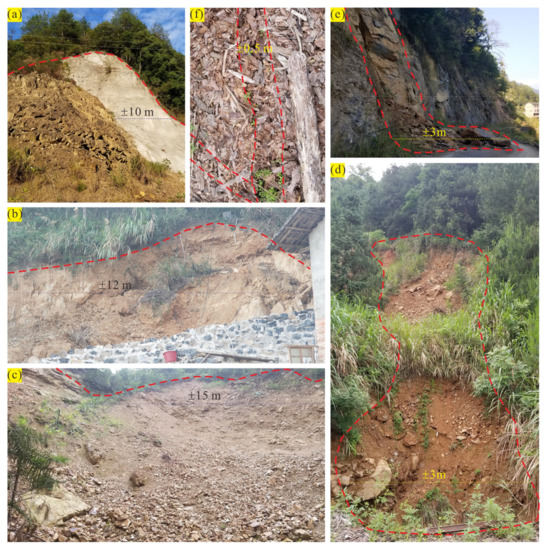 It took several months to investigate the MG that occurred in Liaojiaping Orefield, and the survey results showed that the landslide, collapse, land subsidence, and fissure erratically took place in this orefield, especially in case of heavy rainfall. The main characteristic of MG is that they usually occur at a different scale around mining and excavated areas. The difference in lithology and physical environment leads to different degrees of outcrop weathering, and in this circumstance, various MGs are triggered in these outcrop areas by various types and scales of human activities. The MGs that occurred (e.g., Figure 3) are mainly medium–small in size in the Liaojiaping Orefield. In this regard, the detached mass of landslides in Figure 3a,b is less than 1000 m3, the biggest collapsed area (Figure 3c) is no more than 500 m2, and other common collapsed areas (e.g., Figure 3d) are about 10 to 100 m2. Most of the collapsed blocks (e.g., Figure 3e) are only several m3, and the ground fissures are normally tens of centimeters in width and several meters in length (e.g., Figure 3f). Some of these MG are interconnected in terms of occurrence; e.g., the ground fissures above the mining areas always occur before the subsidence, and the places often affected by the collapse may concurrently produce landslides.