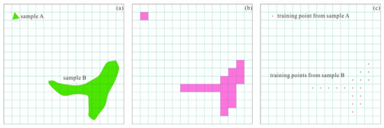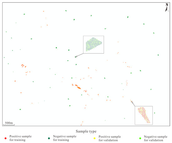 In conventional WofE analysis, all the samples are abstracted as the training points regardless of their spatial size. This process is able to reduce the number of sample occurrences and directly affects the correlation based on probability analysis between samples and evidential factors. Therefore, the areas of the sample occurrence are firstly identified and then grided into the same cell size as other factors of the study area. In this way, every sample area is converted into a certain number of training points for spatial correlation analysis (Figure 4). In addition, this approach is also suitable for improving samples to train machine-learning-based prediction models.