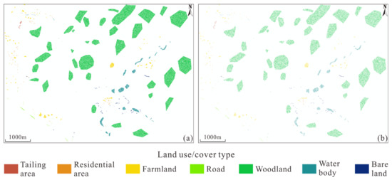 Finally, by applying the RF-based constructed model to the whole dataset, the classification result of the seven-class land cover map is presented in Figure 8. In this study area, the woodland has the highest proportion of up to 81.96%, farmland occupies 8.86%, and the other classes range from 1.19% to 3.42%, except for the tailing area (0.07%). This result is highly consistent with what has been observed in the recent field survey.