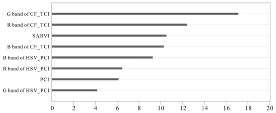 The raw variable importance can indicate its contribution to the generation of every class. It can be seen that the filtering process on the TCI is most favorable for the identification of different land covers, while SARVI comes second, and HSV transformation also performs rather well (Figure 7).