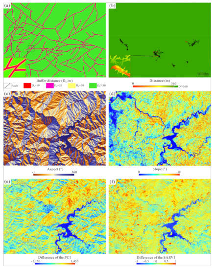 Predictive factor layers: (a) distance buffers of the structure, (b) difference in elevation between underground excavation and surface, (c,d) aspect and slope, and (e,f) difference between the PC-1 and SARVI.