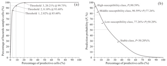 The constructed RF-based prediction model was applied back to the whole data matrix, and every row returned a probability (P) value of classification, containing positive and negative classes. The returned positive class can be considered as the prediction result of MG occurrence probability or susceptibility. The whole dataset is ranked according to the probability values from high to low, and the cumulative percentage of the predictive cells and predicted sample cells can be calculated. Then, the prediction efficiency curve (PEC) and prediction probability curve (PPC) can be plotted (Figure 12). Three thresholds of 1, 2, and 3 were determined on the PEC (Figure 12a), and their corresponding probability values were 90.59%, 77.26%, and 50.20%, respectively (Figure 12b). According to these three thresholds, the whole study area, relative to the occurrence of MG, was divided into four susceptibility classes consisting of high, middle, low, and stable (Figure 13b and Table 5). For the high-susceptibility areas, 2.82% of the total grid cells hold 85.60% of the disaster samples. The stable areas occupy 79.79% of the study area, containing almost no disaster sample.