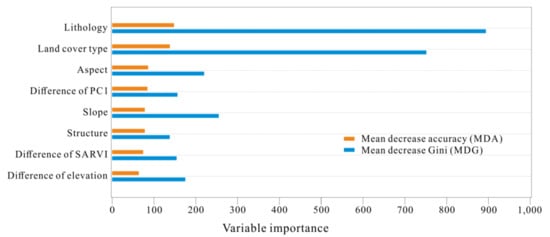 (2) Based on variable importance analysis, the highest contribution to MGM is related to lithology and land cover among the observed environmental factors, which usually indicate the stability of geological bodies and should be employed to map the geo-disaster susceptibility. In addition, we are able to understand the contribution of variables to the risk modeling through importance analysis of variables; nevertheless, the quantitative analysis of the correlation between the geo-environmental factors and MG based on geostatistical method will allow us to achieve a better understanding of their spatial correlation. In any cases, it is necessary and reasonable to involve all the predictive factors for MGM.