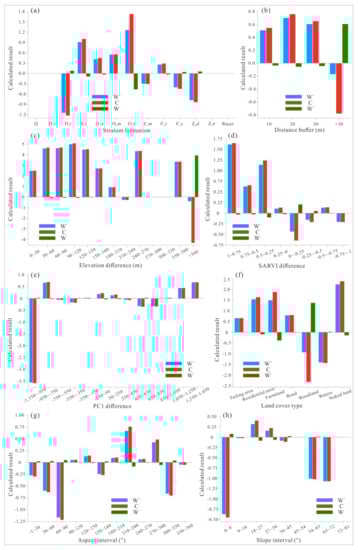 Every predictive factor was divided into different intervals with its property categories (e.g., lithology of the strata, distance buffers of the faults, and the land cover map) or property value (e.g., elevation difference between the terrain surface and the underground excavation, SARVI difference, PC-1 difference, aspect, and slope). Then, the correlation indexes of every interval with MG occurrence, including positive and negative weights (W+ & W−) as well as the contrast (C), were calculated by the WofE method and presented in Figure 15.