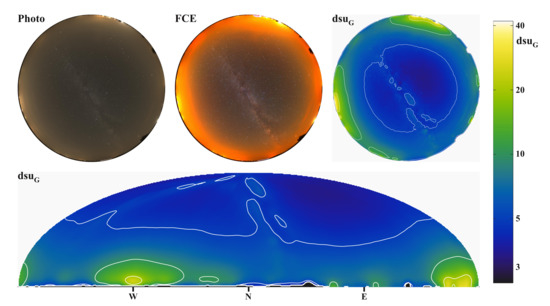 The simple instruments commonly used (e.g., Unihedron Sky Quality Meter) are essentially illuminance meters. Still, they have a limited field of view and are calibrated to give a part of the sky’s average radiance (approximately luminance). These instruments proved helpful, especially in the early days, and they are still significant in sky quality determination. However, they only provide information on a small part of the sky, and their spectral sensitivity is different from that of all other instruments. With the development of digital cameras, it has become possible to make more precise but often at lower temporal resolution measurements with cameras equipped with fish-eye optics of appropriate quality [1,3]. Image radiance measurements have opened a new way of determining sky quality. A significant flaw that remains with fish-eye systems is that near the horizon, where the sky is more illuminated by the dome of light from settlements, the lens’s vignetting effect is most vital, making measurements uncertain.