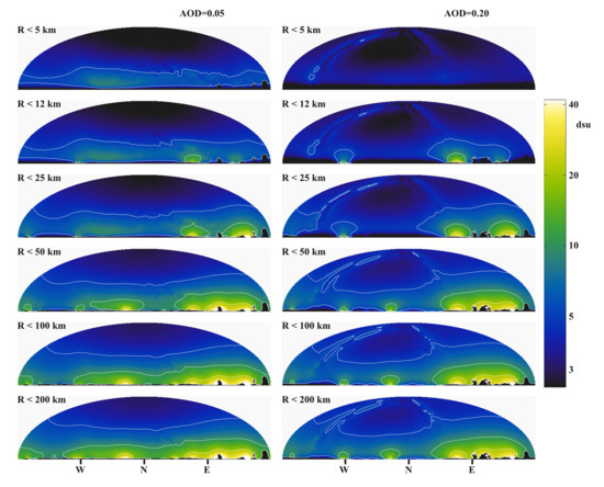 3.2. Dependence of Sky Radiance on the Distance of the Sources