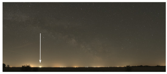 - Jechow, A.; Hölker, F.; Kolláth, Z.; Gessner, M.O.; Kyba, C.C.M. Evaluating the summer night sky brightness at a research field site on Lake Stechlin in northeastern Germany. J. Quant. Spectrosc. Radiat. Transf. 2016, 181, 24–32. [Google Scholar] [CrossRef] [Green Version]