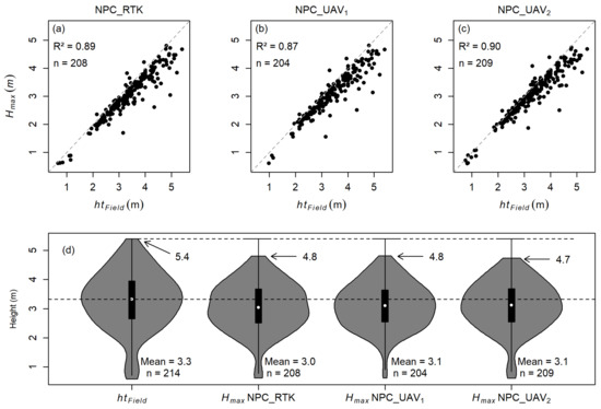 Scatterplots (a–c) and boxplots (d) of observed () versus estimated () tree heights from UAV photogrammetry, considering three normalized point clouds (NPC). The dashed line in (d) represents the mean value of .