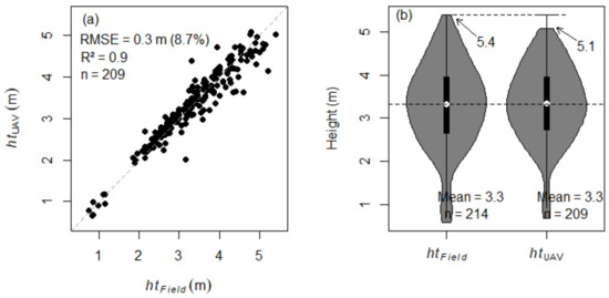 Scatterplot (a) and boxplot (b) of observed () versus estimated () tree heights from UAV photogrammetry in a young Eucalyptus stand. The dashed line in (b) represents the mean value of .