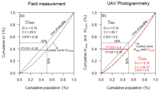 Lorenz curve and uniformity metrics of a young Eucalyptus stand. The metrics are based on tree heights (ht) estimated from (a) traditional field inventory, and (b) UAV photogrammetry data ( in black and in red).