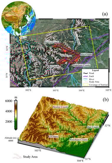 The study area is located along the national road near Wenchuan County in the southwestern Sichuan Province, China (Figure 1). It is a typical mountainous area with steep slopes near the Longmenshan fault, hit by a heavy Ms. 8.0 earthquake in 2008. The complex geographical environment provides a good environment for the growth of a large number of potential landslides. Therefore, this area is highly susceptible to landslides and other geohazards. There is one main road along the valley, including part of the G213 and G317 China national highways, which is surrounded by steep high mountains on both sides, with the valleys are eroded by Minjing River and Zagunao River (Figure 1a). The area marked with red lines in Figure 1b is the specific study area, with an altitude of about 3000–4000 m, involving four counties: Li County, Wenchuan County, Mao County, and Heishui County. The climate is relatively dry, with heavy rains in summer, leading to the frequent occurrence of natural disasters in this season, such as the landslide in Xinmo Village, Maoxian County in 2017, which had more than 90 casualties [37,38,39,40,41,42].
