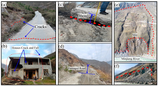 Through the field investigations of these three typical slopes (as shown in Figure 4), some damage cracks on the roads (Figure 4a) are observed in the d1 slope. By visiting residential houses in the deformed area, we found that due to ground deformation the houses had already suffered serious cracks and uneven subsidence (Figure 4b). For the d2 slope, there was sparse vegetation and clear damage could be seen along the road on the slope. Through on-site measurement, maximum displacement reaches 30 cm (Figure 4c,d). The front edge of the d3 slope is relatively broken due to the erosion of the Minjiang River, with obvious sliding phenomena (Figure 4e,f). Evident cracks have appeared in the trailing edge and two flanks, resulting in a high risk of slope failure and even blocking of the Min River.