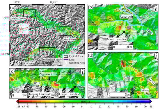 For the purpose of comparison, the same typical areas (b, c, d) were selected as in Figure 3, and were enlarged and shown in Figure 5b–d. In general, the identification results of SBAS-InSAR and Stacking-InSAR are highly similar. Among the three key areas, it is obvious from Figure 3b–d and Figure 5b–d that the landslides with high displacement levels (e.g., slopes near Heishui County Reservoir, Taoping Township Landslide and Feihong landslide group) are both presented in the two methods. However, some differences in the results from the two methods can be seen. For example, the Mowa landslide is undetected in the SBAS-InSAR results (Figure 5d), owing to the huge displacement level, a maximum displacement of 120 mm/year.