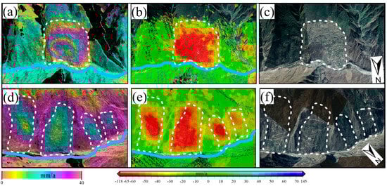 The potential landslides that can be identified by both methods. (a–c) Stacking-InSAR result, SBAS-InSAR result, Google Earth optical image of Taoping landslide, respectively; (d–f) Stacking-InSAR result, SBAS-InSAR result, Google Earth optical image of Taoping Township landslides group, respectively.