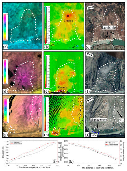 In another two cases (Figure 8d–i), atmospheric impacts were revealed. As shown in the white dashed area in Figure 8d,g, wide but vague displacement can be seen in Figure 8d,g. However, this does not match the shape of the terrain on the optical image in Figure 8f,i, which looks similar to the characteristics of the atmosphere. In order to verify this, we extracted the displacement and elevation along two profile lines, AB and CD, in Figure 8d,g, respectively (shown in Figure 8j–k). It is obvious that there is a strong correlation between displacement and elevation along both profiles AB and CD. This is typical of the elevation-dependent atmosphere in mountainous areas, which is correlation in time and space, and cannot be removed by Stacking-InSAR. The corresponding results from SBAS-InSAR in Figure 8e, h reveal the small displacement (about 30 mm/year), as SBAS-InSAR could model and remove the atmosphere effect to some degree.