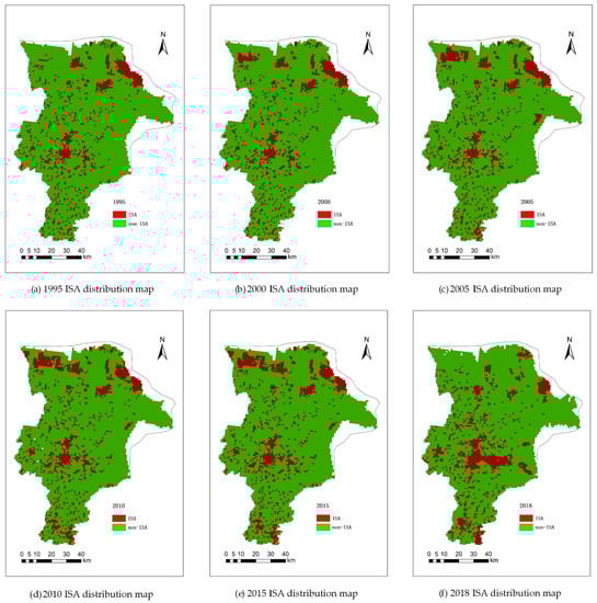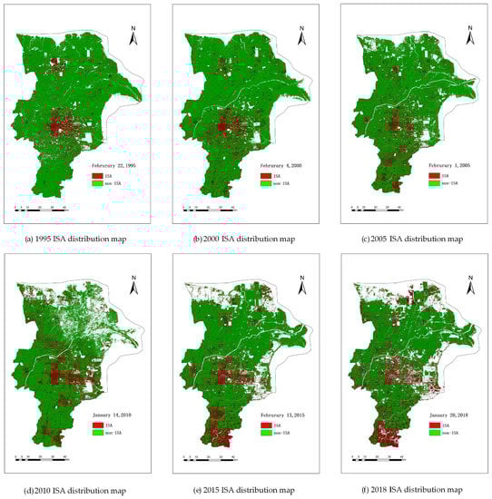 - From 2005 to 2018, the ISA in the south of Figure 6 has an obvious expansion trend, forming a relatively dense ISA area, while the ISA in the corresponding position of Figure 9 is relatively thin. Viewing the image of Google Earth corresponding to the year, it can be seen that this area is composed of a large number of typical ISAs such as residential areas, factories, hospitals, and schools.
