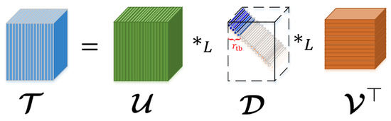 In [24], Kernfeld et al. extended the t-product to the tensor -product by replacing DFT by any invertible linear transform induced by a non-singular transformation matrix , and established the framework of -SVD. In the latest studies, the transformation matrix defining the transform L is restricted to be orthogonal [18,26,31,32] (unitary in [25,27]) for better properties, which is also followed in this paper.