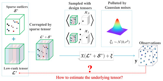 According to the observation model (6), the true tensor is first corrupted by a sparse tensor and then sampled to N scalars with additive Gaussian noises (see Figure 2). The corrupted positions of are further assumed in Assumption A1 to be totally observed with design tensors in , and the remaining uncorrupted positions are sampled uniformly through design tensors in .