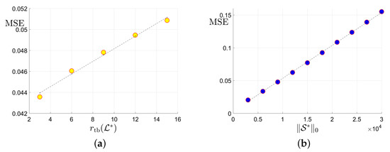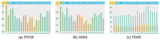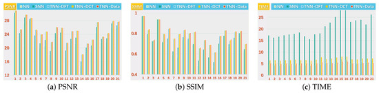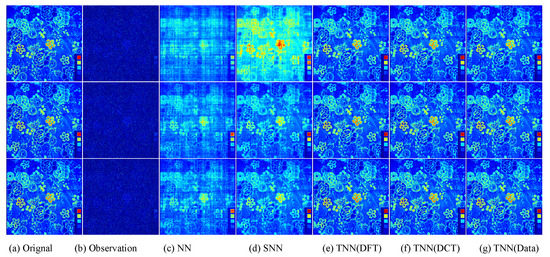 As proved in [26,27], –TNN is the convex envelop of the -norm of the –multi-rank in unit tensor -spectral norm ball. Thus, –TNN encourages a low –multi-rank structure which means low-rankness in spectral domain. When the linear transform L represents the DFT (although we restrict the in Equation (4) to be orthogonal, we still consider TNN as a special case of –TNN up to constants and real/complex domain) along the 3-rd mode, –TNN and tensor -spectral norm degenerate to the Tubal Nuclear Norm (TNN) and the tensor spectral norm, respectively, up to a constant factor [26,33].