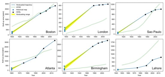 3.4. Cross-Comparison to HYDE and Hind-Casted GHSL Trajectories