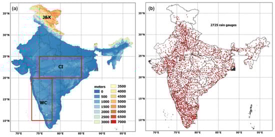 (a) Topography (m) distributions across India, and (b) locations of 2725 reporting IMD rain gauges for a typical day in July 2014. Two rectangular boxes shown in Figure 1a indicate central India (CI) and west coast (WC) of India considered for detailed analysis.