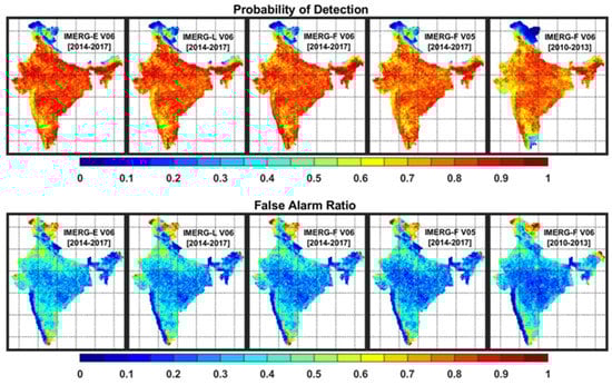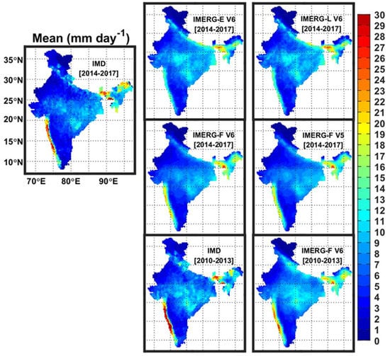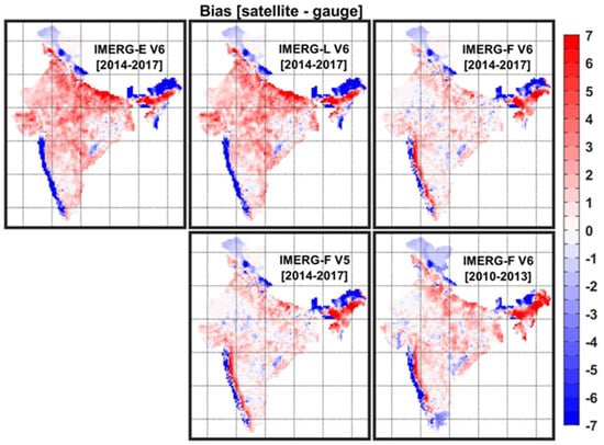 The IMERG is a unified US algorithm that benefits from CMORPH, PERSIANN, and TMPA algorithms [,]. IMERG suite provides global precipitation estimates at half-hourly interval and at 0.1° spatial resolution. There are three Runs of this product intended for different user requirements based on latency and accuracy. Early Run or IMERG-E is available after 4 h of acquisition time and relevant for flash flooding, whereas Late Run or IMERG-L product is available after 14 h of satellite acquisition time and is supposed to be good for crop forecasting. Final Run or IMERG-F is intended for research and is available after 3.5 months. IMERG-F utilizes monthly rain gauge information over land from the Global Precipitation Climatology Center (GPCC) for bias adjustment. However, the number of rain gauges utilized in IMERG-F through GPCC is less than 300. It indicates that IMERG-F uses about one-tenth of the total number of rain gauges used in the IMD rain-gauge-based gridded rainfall data. In addition, IMERG-F uses monthly rain gauge observations and further downscales the precipitation estimates to half-hourly scale. In V6, IMERG has been computed for the first time for both TRMM- and GPM-era. Thus, IMERG V6 is available since June 2000. A detailed description of the changes in V6 from V5 is provided by Huffman et al. []. Version 06B (V6 hereafter) of half-hourly IMERG-E, IMERG-L, and IMERG-F, and version 05B (V5 hereafter) of IMERG-F for the southwest monsoon season of 2014–2017 has been used in this study. Additionally, IMERG-F V06B for June to September of 2010–2013 has been used to compare the changes in error characteristics during pre-GPM (e.g., 2010–2013) and GPM (2014–2017) periods. All IMERG products (e.g., near-real-time versus research product, V5 versus V6 research product, and pre-GPM versus GPM periods) have been considered for an equal 4-year period for consistency.