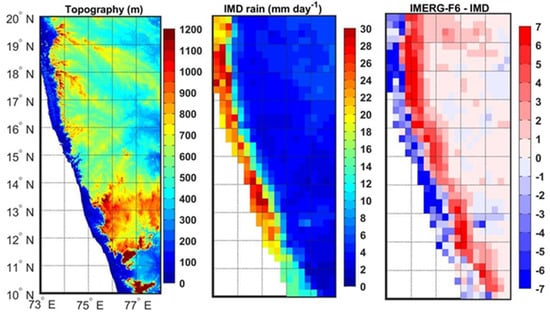 Spatial distributions of topography (m), mean monsoon rainfall (mm day−1) from the IMD rain-gauge-based data, and bias (mm day−1) in IMERG-F version 6 estimates for 2014–2017 over west coast of India.